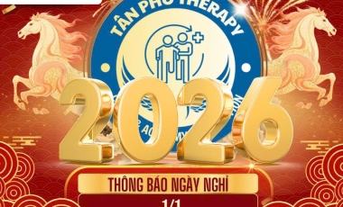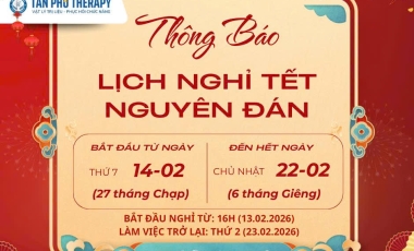 - Nghỉ 01 ngày: Thứ Năm, 01/01/2026 - Hoạt động trở lại bình thường: Thứ Sáu, 02/01/2026 - Nhân dịp năm mới, Tân Phú Therapy kính chúc Quý khách hàng và gia đình: - Sức khỏe dồi dào